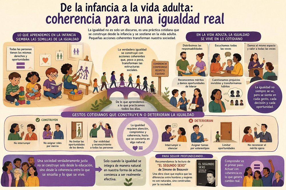 Lo que aprendemos en la infancia solo adquiere verdadero sentido cuando se sostiene en la vida adulta. La igualdad de género y la igualdad real forman parte del discurso político, académico y social, pero la experiencia cotidiana demuestra que la igualdad formal no siempre se traduce en una igualdad efectiva. La verdadera igualdad no es una declaración de intenciones ni un concepto abstracto, sino una práctica constante que se refleja en nuestras acciones y que, poco a poco, transforma las estructuras sociales.